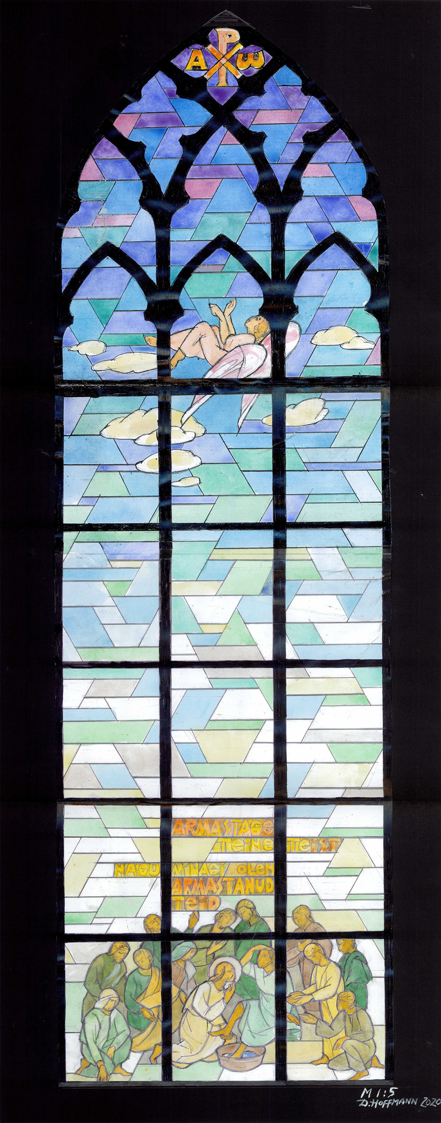 Hoffmann’s love for stained glass, which she came to after working with fresco, sgraffito and mosaic, began with Chartres Cathedral – or rather, with a book about it. The Chartres album, acquired with great difficulty from a Finnish acquaintance, became her gateway to the art form. In the Soviet Union, religious imagery was banned as “propaganda”, and examples of stained glass in Estonia were virtually nonexistent. Alongside a 1939 brochure on medieval stained glass, this book became her primary source of learning. When she finally visited France in 1993, the director of the International Stained Glass Centre in Chartres, after reviewing photographs of her work, asked where she had trained. To him, her work seemed to represent the “Chartres school”. In this sense, it is fair to say that Hoffmann’s style and artistic language were shaped by the traditions of medieval Europe.