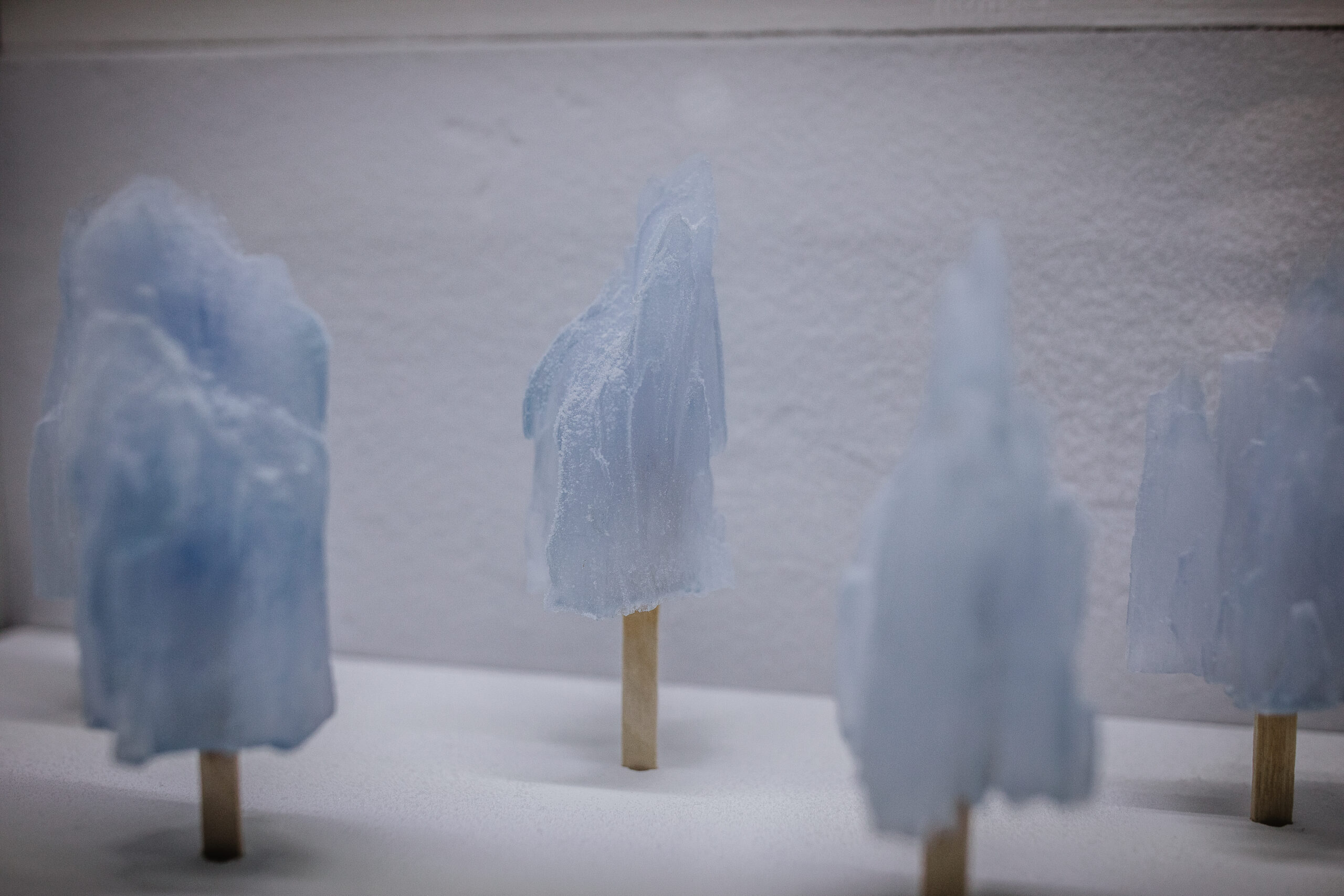 “Ajutiste skulptuuridega” (2024) – see on nende jäätükkidega töö nimi – tahtsin leida teatavat võrdpilti või objekti, kus nauding ja valu oleksid ühes objektis koos. Need meenutavadki jäätiselaadseid objekte, aga samas on tehtud liustikujääst. Meie naudingutel on teatav otsene mõju meid ümbritsevatele ökosüsteemidele, naudingud võimendavad kliimamuutust. Idee oli, et äkki saaks neid objekte ka päriselt näitusekülastajatele pakkuda, üritasin erinevate jäätisetootjatega koostööd teha (et toiduohutus oleks tagatud, et oleks mingisugune maitse jne), aga see lõpuks ei õnnestunud.