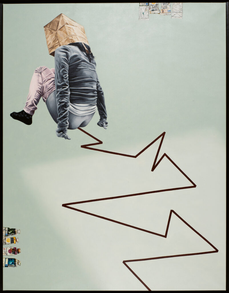Muide, väljapanek laieneski esialgsest esimese korruse näitusesaalist muuseumi teisele korrusele muude püsieksponaatide vahele, kus see imelikult efektselt sealsete portselanfiguriinidega koos tööle hakkas. Teoseid sai riputatud ka trepihalli ja üks pilt oli isegi peaaegu tualetti trüginud – see oli muidugi trikster Alexei Gordini “Nimeta” (2021).