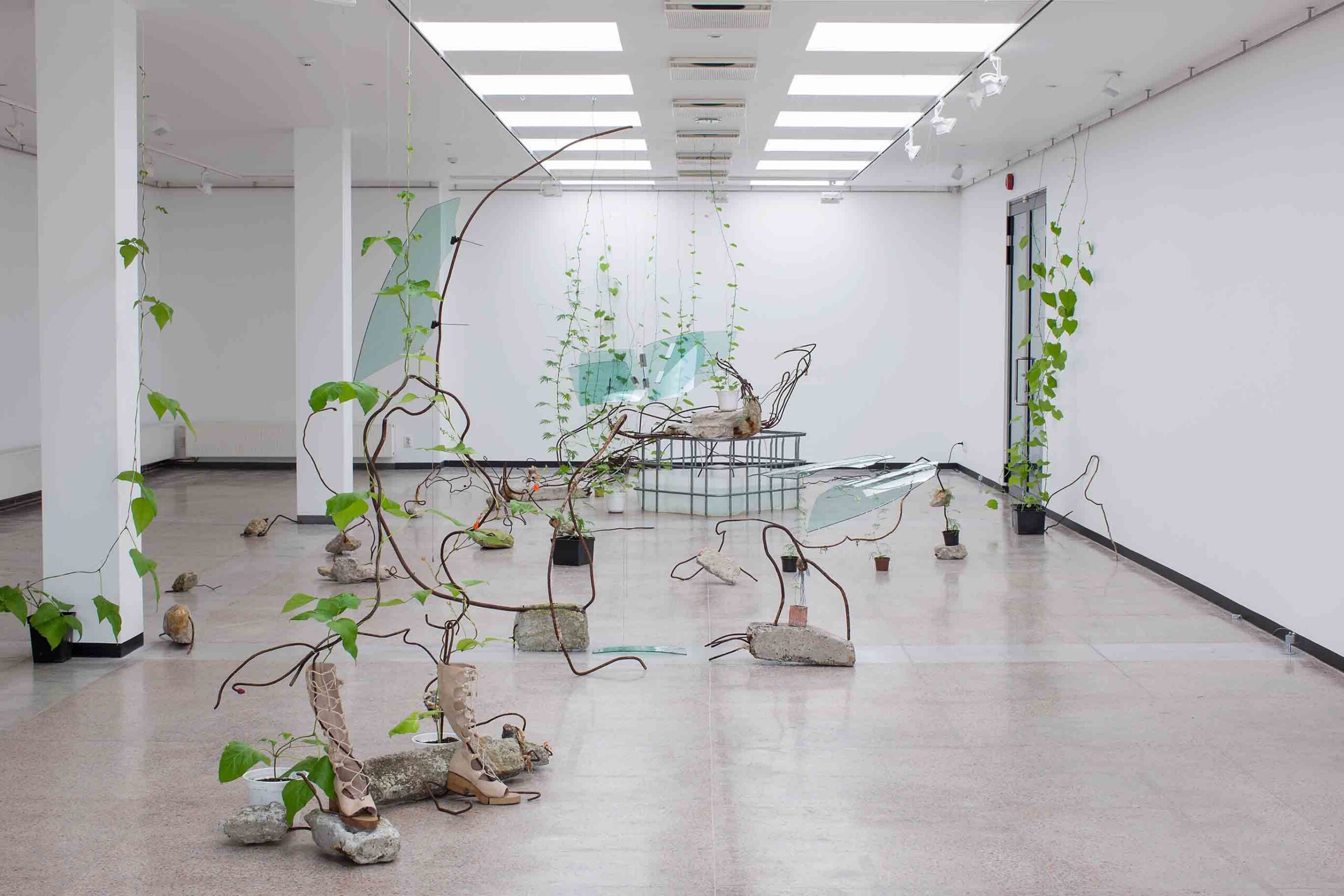 On 2020. aasta juulikuu lõpp, sumeda ja kauaoodatud suve keskpaik, mil loodus on kõige elujõulisem ja lokkavam. Haapsalu Linnagaleriis avatud Mari-Leen Kiipli näitus “Husa”2 on kui selle välise lopsakuse orgaaniline jätk suvise kuuma eest jahutust pakkuvates siseruumides. Betoon, klaas, raudorad, voolav vesi ja selle kõige vahel maast laeni rippuvad ning inimloodud materjalidega põimuvad ronioad: kuurortlinna galeriis avaneb vaade tulevikule, kus inimest, kes asfalteeriks, betoneeriks, kaevaks, lõikaks, saeks ja niidaks, enam ei ole ning loodus võtab tükk tüki haaval jälle üle. Mida ta alati teebki, kui talle selleks vähegi võimalus anda.