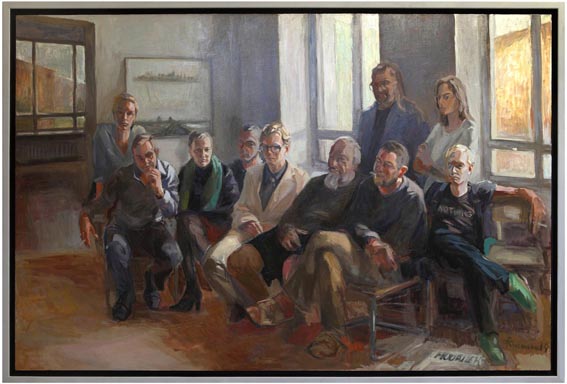 Mõningad valikud olid ilmselged – klanitud Indrek Grigor heledas ülikonnas Johannes Semperina, enamasti aknalaudadele nõjatuv Ilmar Kruusamäe Ferdi Sannamehe asemel. Teistel sai määravaks poos – laia joonega Peeter Allik samavõrd mõjuka Adamson-Ericu vastu, Kiwa vabalt toolileenile naalduv asend Richard Sagritsana. Ja siis loomulikud kooslused nagu Rauno Thomas Mossist, Nadežda Tšernobaist, Kaire Nurgast moodustuv kolmik või tagareas eraldi konutav Jevgeni Zolotko (kes on selgelt kehatuna juurde maalitud nagu minu jaoks tundmatu isik algse teose samas positsioonis). Võimalike variantidena olid kaalumisel ka mitmed teised Tartu kunstielus kaasaütlejad (näiteks Rael Artel, Imat Suumann või Indrek Hirv) ning ma ei proovigi väita, et tegemist on mingisuguse sügavalt filosoofilise, poliitilis-kontseptuaalse või vabamüürlaslikult konspiratiivse valikuga, nagu mõningad vaatajad on arvanud. Seda, kuivõrd post-, alter- või hüpermodernistliku sammuga on tegu, võivad kunstiloolased minugi pärast Facebooki seintel lõpmatuseni arutada.